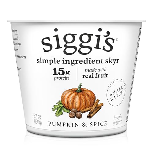 Siggi's Pumpkin & Spice Yogurt – 15g protein, 14g carbs per serving. A great option with naturally less sugar.